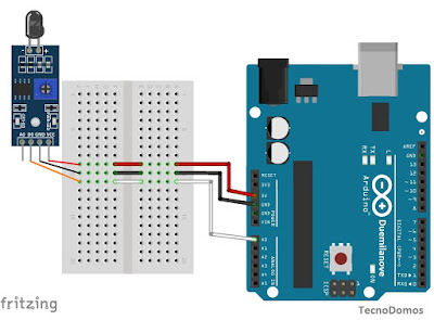 Neste primeiro ensaio, o sensor vai ser conetado ao nosso arduino utilizando a sua saída analógica, permitindo desta forma determinar se existe um foco de incêndio na sua área de ação.