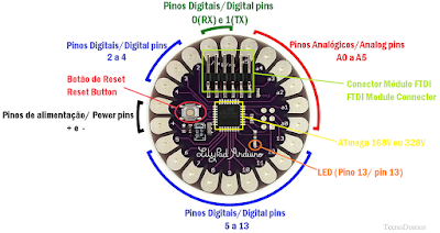 Nota: A versão do Arduino Lilypad da imagem é diferente da quer estamos aqui a analisar, serve a imagem apenas para demonstrar o seu modo de utilização.
